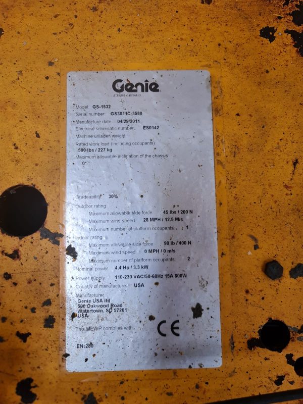La plataforma elevadora de tijera eléctrica GENIE 1532 ofrece un trabajo silencioso en aplicaciones de construcción, mantenimiento e instalaciones en interiores y exteriores en superficies niveladas.