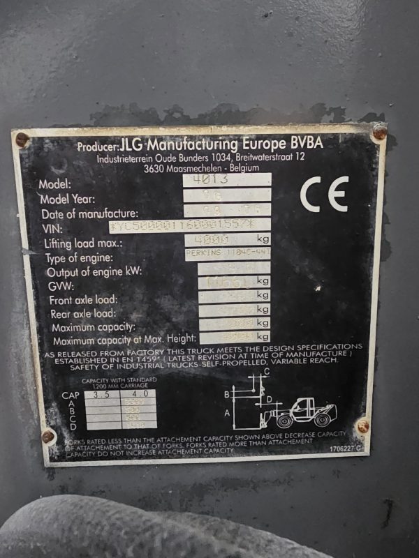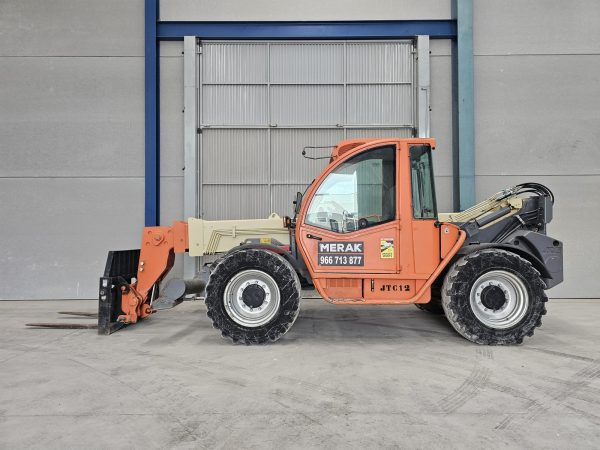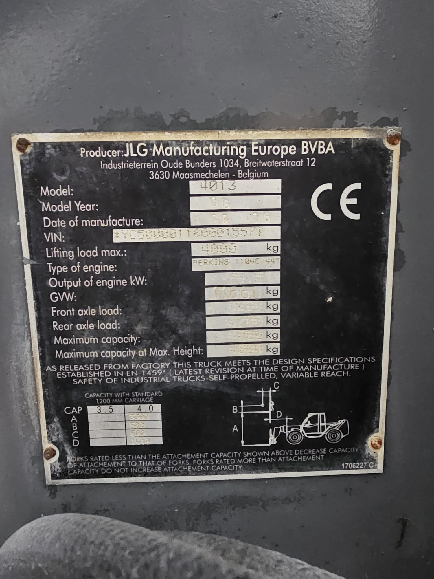 Este manipulador telescópico JLG, modelo 4013, tiene una altura de elevación de 13 metros, con capacidad de carga de 4.000kg . Además, ofrece un alcance lateral de 4.2mts.