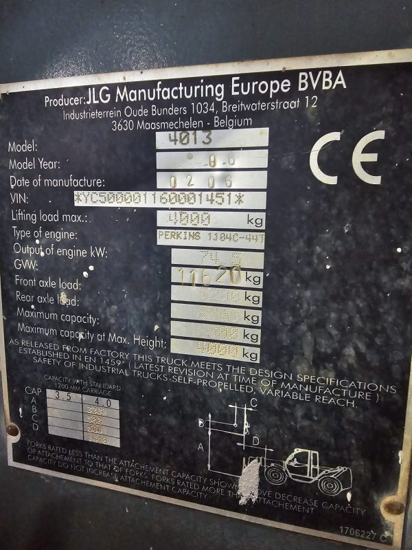 Manipulador teléscopico de la prestigiosa marca JLG, modelo 4013w, tiene una altura elevación máxima de 13mts con una capacidad de carga de 4000kg, con un alcance lateral de 9.20mts. Fabricado en el 2016 y cuenta con tan solo 6.110horas de trabajo.